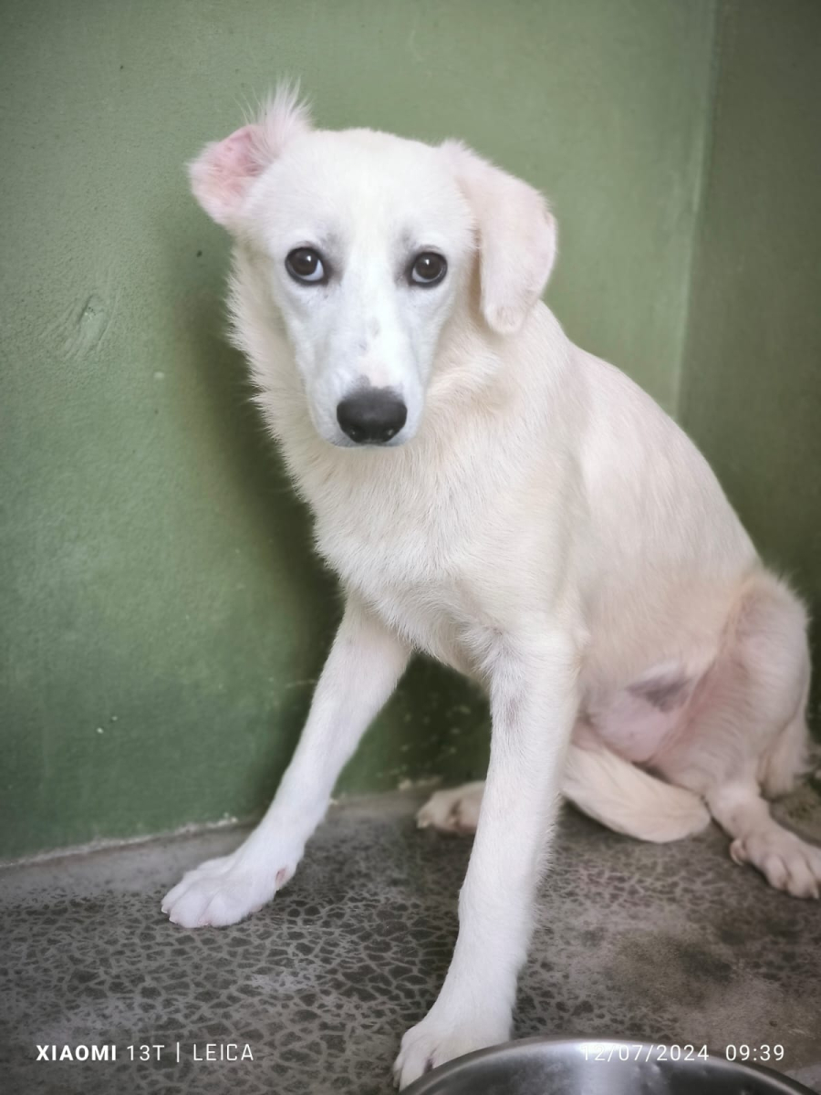 Carattere timido. Non abituato ad andare al guinzaglio.